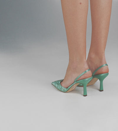 Slingback in raso color verde acqua, illuminata da una raffinata applicazione di cristalli che crea un motivo ad onda dai bagliori preziosi.